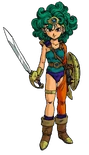 La Heroína lleva lo que parece ser un leotardo, tanto en el brazo como en la pierna izquierda. También lleva polainas azules, cubiertas por sus botas y, al igual que el héroe, tiene el pelo verde largo, aunque el suyo es rizado. También tiene pendientes en forma de Limo y pulseras en ambas muñecas. Lleva la funda de la espada Zenithian en su hombro derecho y su escudo en su brazo izquierdo.