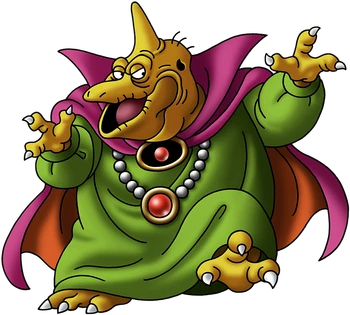 Baramos is a dragonic monster that also uses a pose similar to the Skelegon monsters. This is further shown once you encounter and face the Bones of Baramos, his re-animated skeleton. Baramos is clothed with a necklace, a green hoodless robe, and a orange and purple cape tied by an emblem.