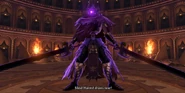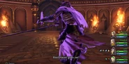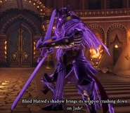 Much like Tyriant, Blind Hatred is a tall armoured skeleton, wearing a purple cape. He wears the Purple Orb in his right eye socket, and wields two swords. The only difference in its appearance is that its colours appear to be darker.