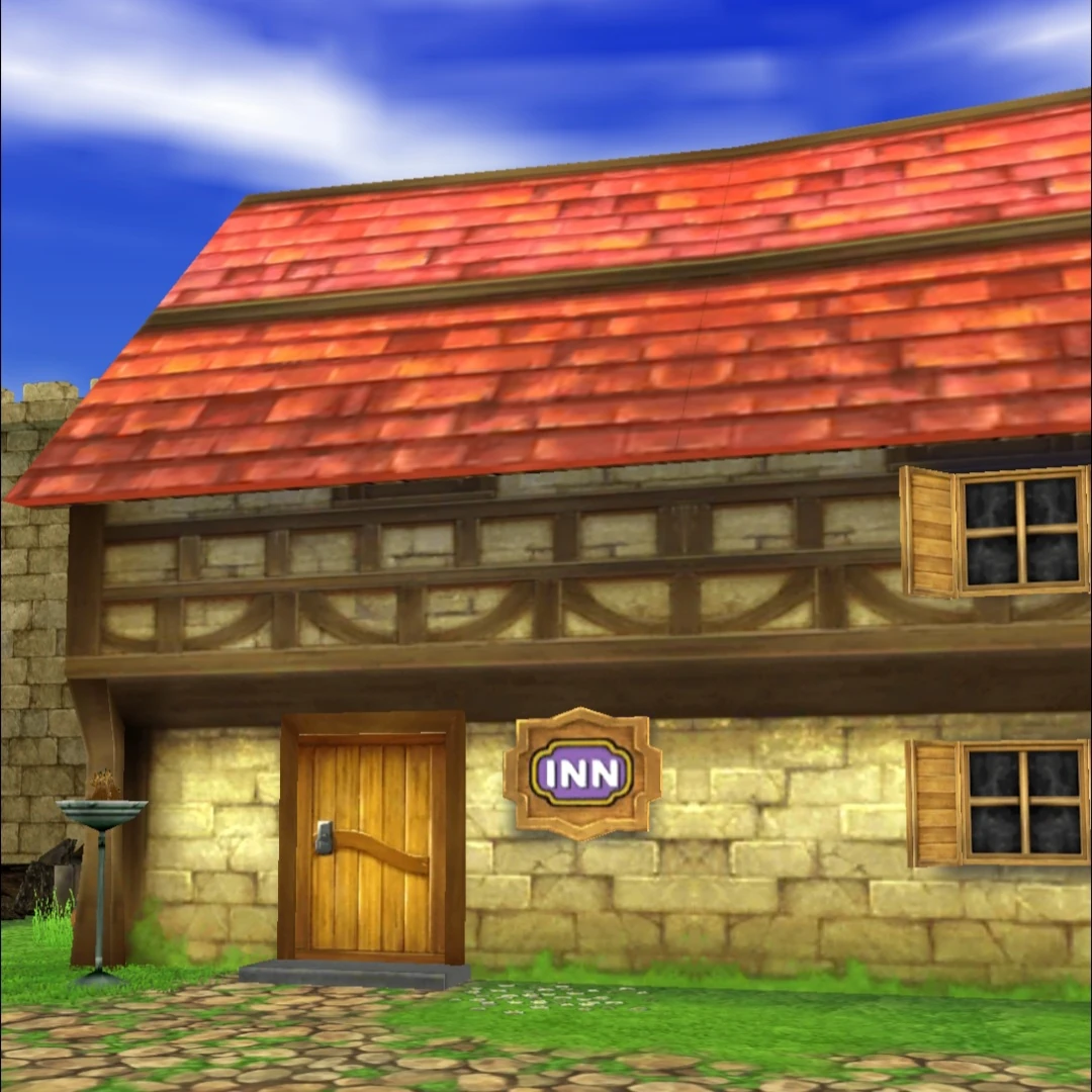 An Inn is a recurring element of the Dragon Quest series, first appearing in Dragon Quest II. The player's party is able to rest the night at an inn, which will fully restore every party member's HP and MP and removes negative status effects except curses and death. Almost all inns charge a few gold coins for this service, which increases as the player progresses through the storyline.