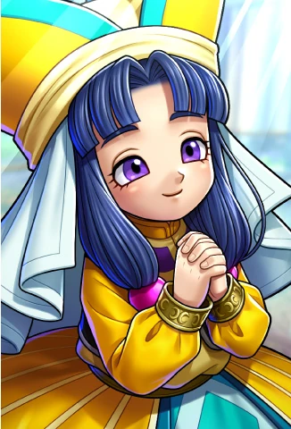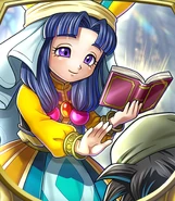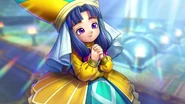 Jacqueline has medium length blue hair and purple eyes. She wears yellow priestly attire that bears similarity to Nevan from Dragon Quest VI.