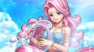 She has a beautiful slim and clear figure; Her hair is long, loose, silky, wavy and pink in color; her eyes are cyan and her lips are light pink; and its scales and fins are pink.