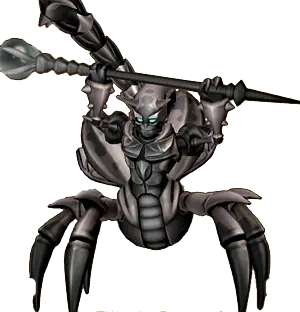 The Scorpider is a humanoid monster with a scorpion-like body that is decorated in red and black and it is armed with a staff for combat.
