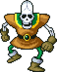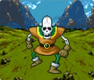 A giant yellow and green garbed version of the Skeleton Scrapper is found in the Dragon Quest VII downloadable content Traveller's Tablet, Snag a Speedy Sword, although it does not seem capable of using the curative magic of its relatives.