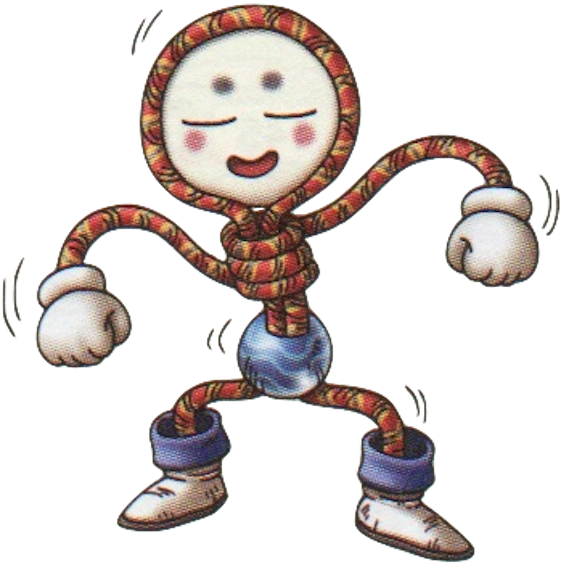 The string fella is a humanoid rope monster that looks exactly like the wire man, but between these two the wire man is generally angry, as for the string fella is happy. The string fella appears to made of elastic tubing (like a bicycle pump) with a blue bead in the middle of the figure.
