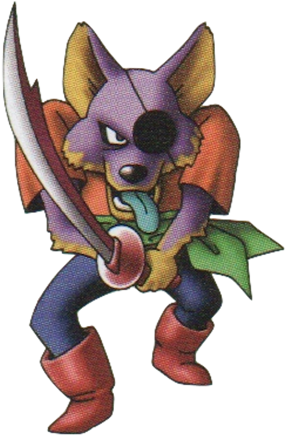 The summer wolf is a bipedal wolf monster with purple fur wears an eyepatch over its eye, wore a pirate's outfit and it is armed with a cutlass for combat.