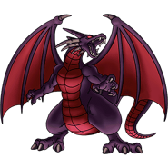 Velzar dons a typical dragon-like appearance, with red skin, glowing red eyes, black horns and large wings.