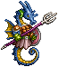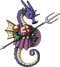 Wharfhorses are big seahorse-like monsters with blue scaly skin and a pair of arms. These monsters are seen wearing a roman-like armour, with the top part being a golden chest armor with silver or platinum details and the foot part being a beige skirt that is held to the Wharfhorse's body by a dark green belt, and a pair of green gloves. Wharfhorses wield a shield, made of gold with silver or platinum details (similar to the armour), and a trident, with a violet metallic handgrip and the rest of it silver or platinum.